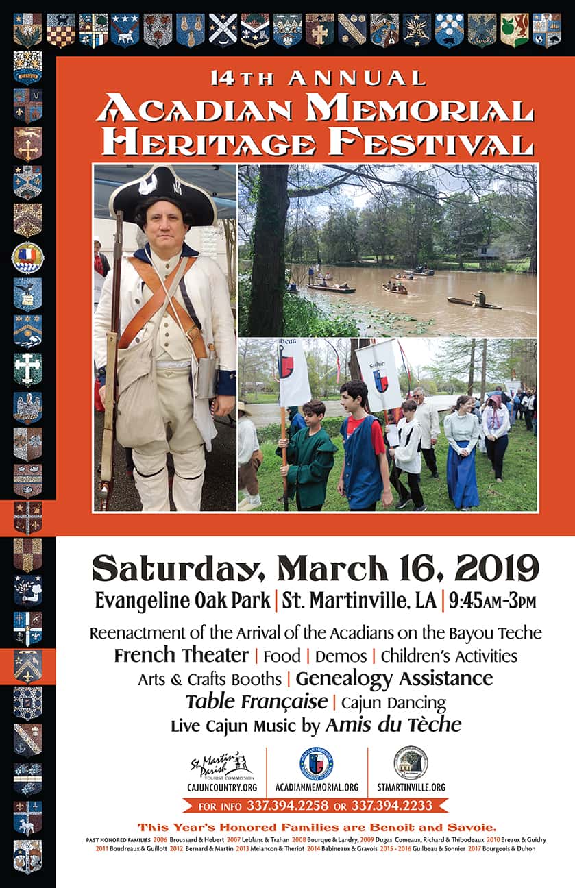 Come take part in the re-enactment of the arrival of the Acadians at the Acadian Memorial Heritage Festival on March 16, 2019 from 10am – 3pm near the Evangeline Oak in St. Martinville!