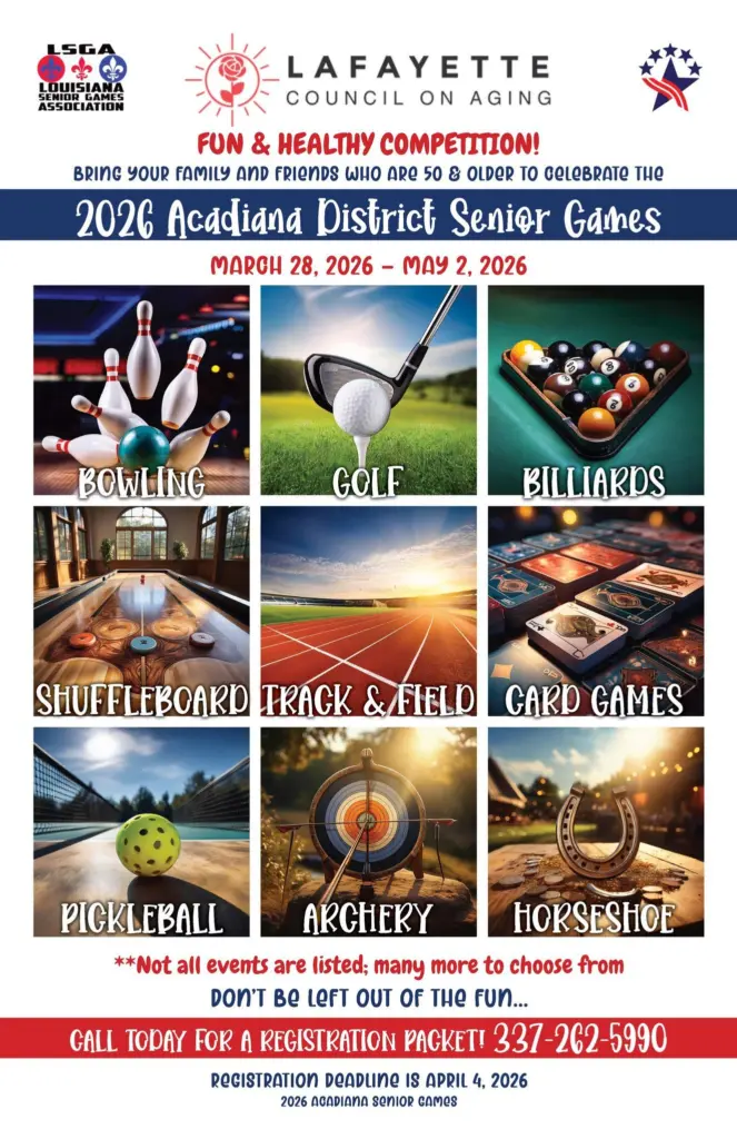Lafayette Council on Aging invites those 50+ to register and participate in the 2026 Acadiana Senior Games. Deadline to register is April 4th. Bowling, golf, billiards, track and field along with card games, pickleball and swimming will be included. Games begin March 28 – May 2 at various locations in Lafayette.
