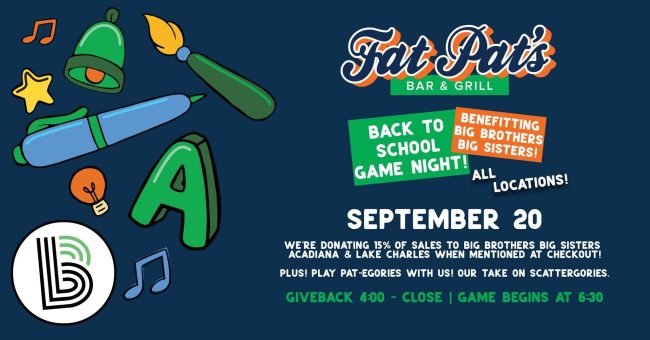 BACK TO SCHOOL FAMILY GAME NIGHT! To benefit Big Brothers Big Sisters of Acadiana at all Fat Pat’s locations for a night of games, food and community support Saturday, September 20th. Bring the whole crew for a night of laughs, family-friendly competition, and Back-to-School prizes for the top three families!