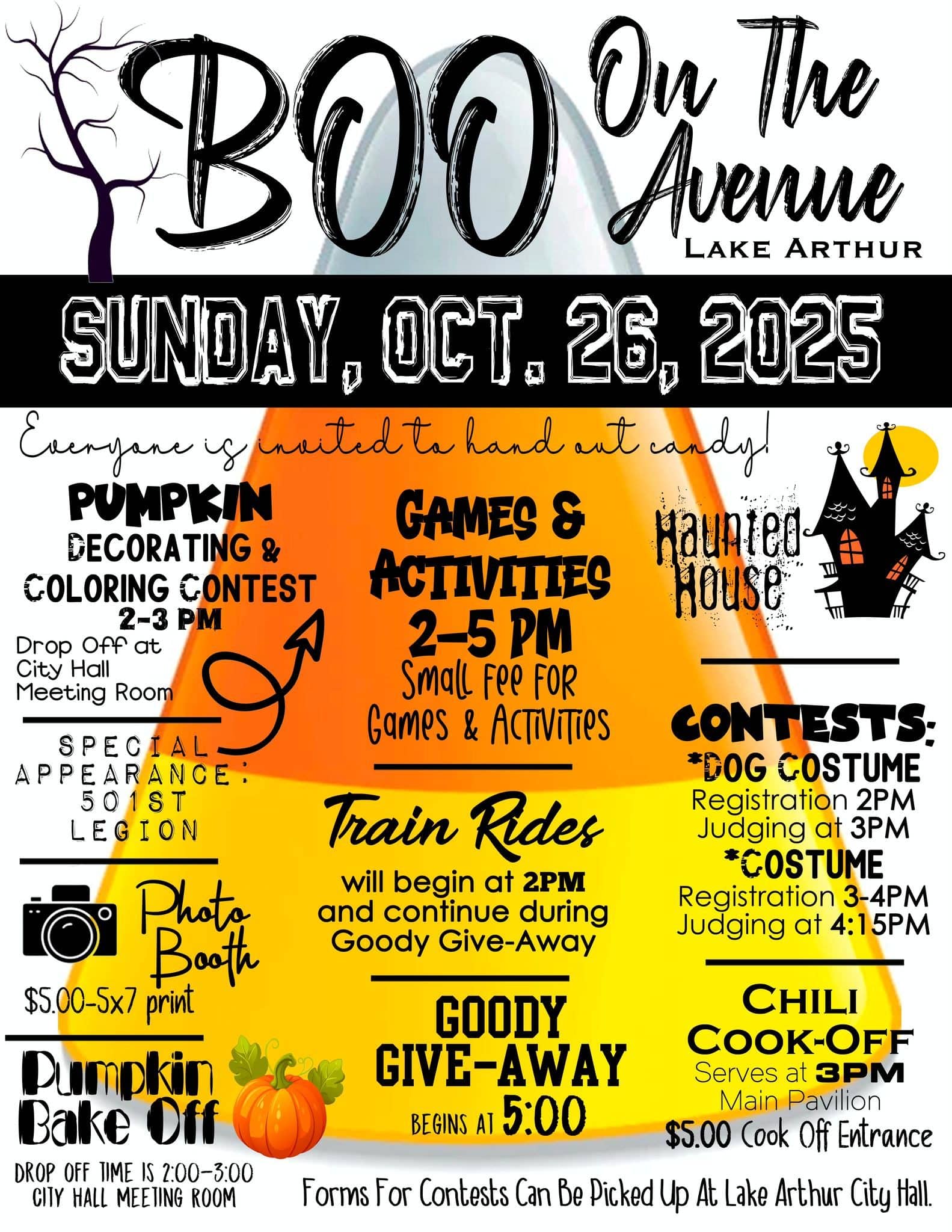 It is Boo on the Avenue in Lake Arthur down Arthur Avenue with a pumpkin Decorating Contest, photo booth, costume contest, chili cook-off, haunted house, dog costume contest, train rides, goody give-away at 5 p.m. Games & activities from 2-6 pm for a small fee.