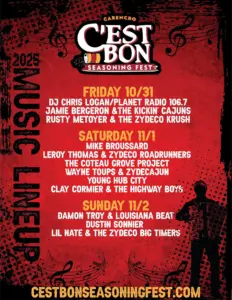 The 2nd annual Carencro C’est Bon Seasoning Fest will take place from Friday, October 31st, to Sunday, November 2nd, 2025. The fun kicks off on Halloween night. The event will have a 5K run, wiffle ball tournament, chili dog eating contest, live music, costume contest, dancing, a seasoning showdown, and so much more!