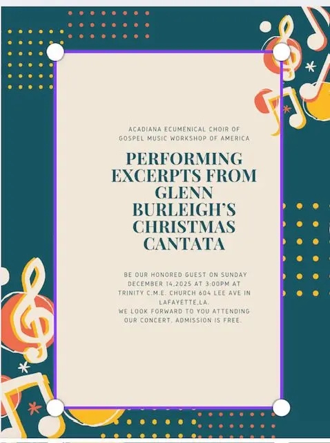 Acadiana Ecumenical Choir of Gospel Music Workshop of America will perform excerpts from Glenn Burleigh’s Christmas Cantata Sunday, December 14th at 3 p.m. a free concert at Trinity C.M.E. Church in Lafayette.