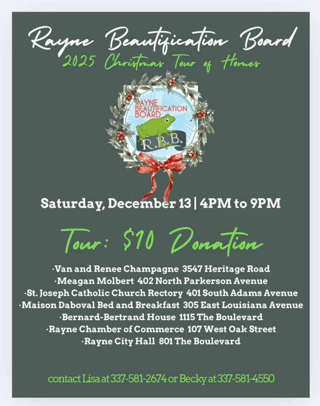 Rayne Beautification Board 2025 Christmas Tour of Homes Saturday, December 13th from 4 to 9 p.m. $10 per ticket donation.