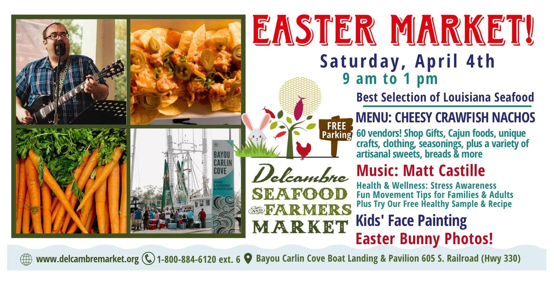 Delcambre Seafood and Farmers Market – First Saturday of the month from March to December except July. Enjoy what’s fresh for the season from area farms and local waters, along with tasting opportunities and recipes, live music, kids activities and other special events at Bayou Carlin Cove Boat Landing and Pavilion. Bayou Carlin Cove Boat Landing and Pavilion, 605 S. Railroad St. (Hwy. 330), Delcambre, 9 a.m.-1 p.m.