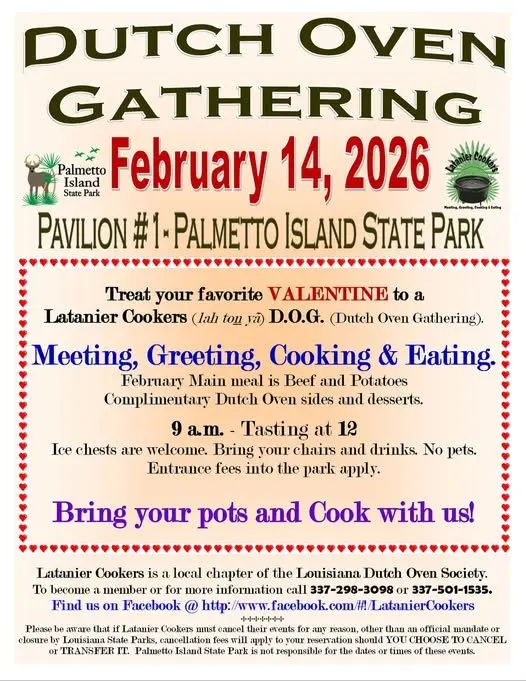 The Dutch Oven Gathering at Palmetto Island State Park will be February 14th beginning at 9 am. The main meal feature is beef and potatoes and complimentary Dutch Oven sides and desserts. Tasting begins at noon, bring your ice chest and lawn chairs.