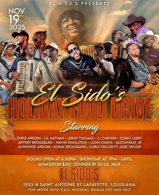 El Sido’s Zydeco & Blues Club’s presents the Holiday Food Drive November 19th. Doors open at 6:30 p.m. and music begins at 7 p.m. Admission is $20 with your food drive donation.