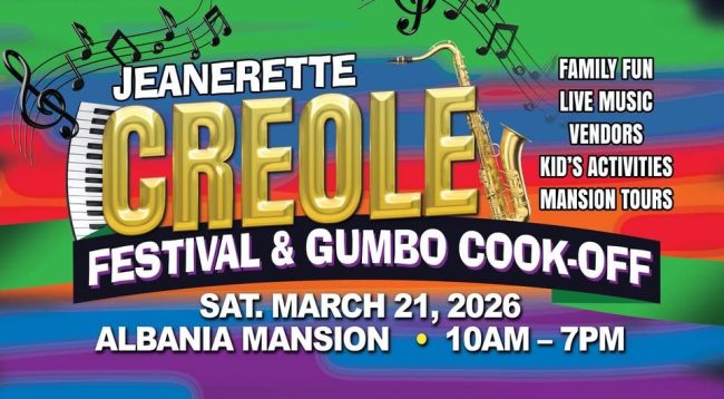 Jeanerette Creole Festival includes a gumbo cookoff and a day of fun March 21st with food and drink vendors, music, arts and crafts booths, mansion tours and more. No outside food or drinks allowed. Albania Mansion, 21066 Hwy. 182, Jeanerette, 10 a.m.-7 p.m.