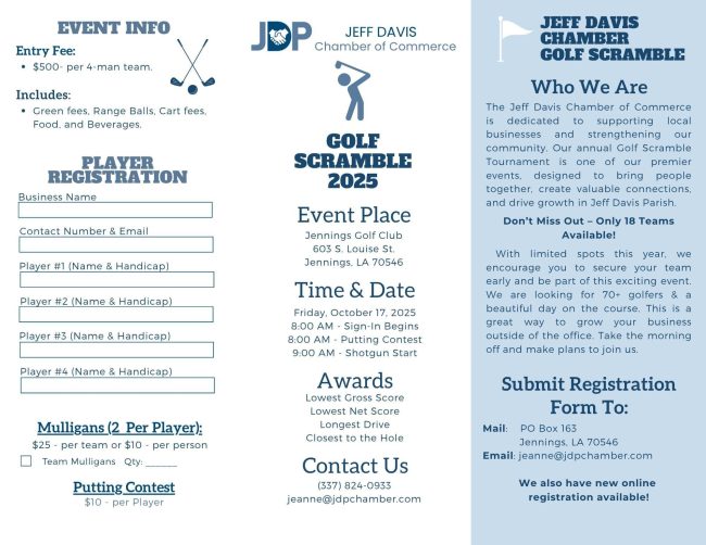 The Jeff Davis Parish Chamber of Commerce is excited to announce our 2025 Golf Scramble!