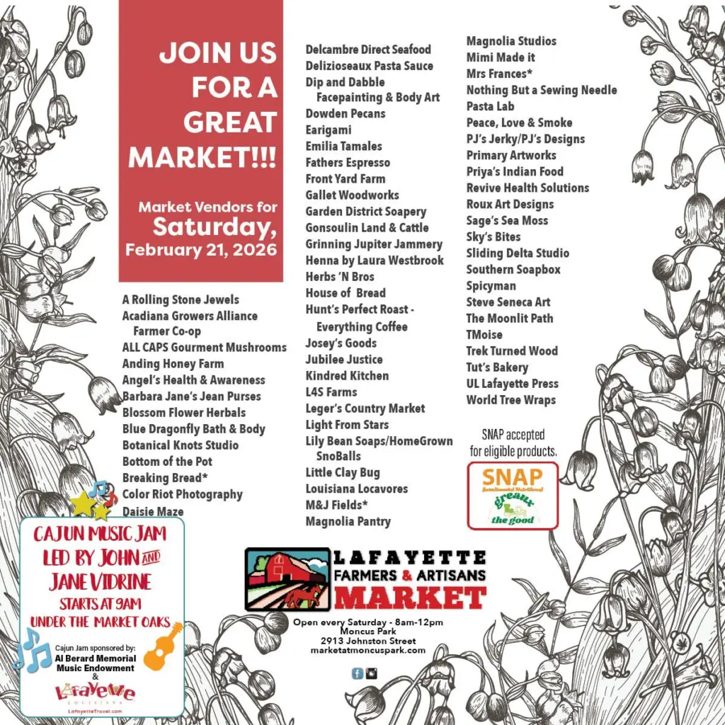 Over 60 Vendors, Cajun Music Jam, Led by John & Jane Vidrine, starts at 9am under the Market Oaks. Jam sponsored by Lafayette Travel. See you at the Market Saturday, February 21st from 8 till noon at Moncus Park in Lafayette.