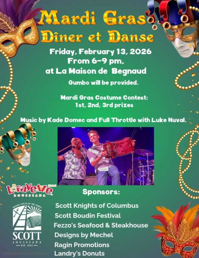The Mardi Gras Dinner and Dance will be held at La Maison de Begnaud in Scott February 13th from 6-9 p.m. Gumbo will be provided. Mardi Gras Costume Contest with prizes for 1st, 2nd and 3rd place and live music.