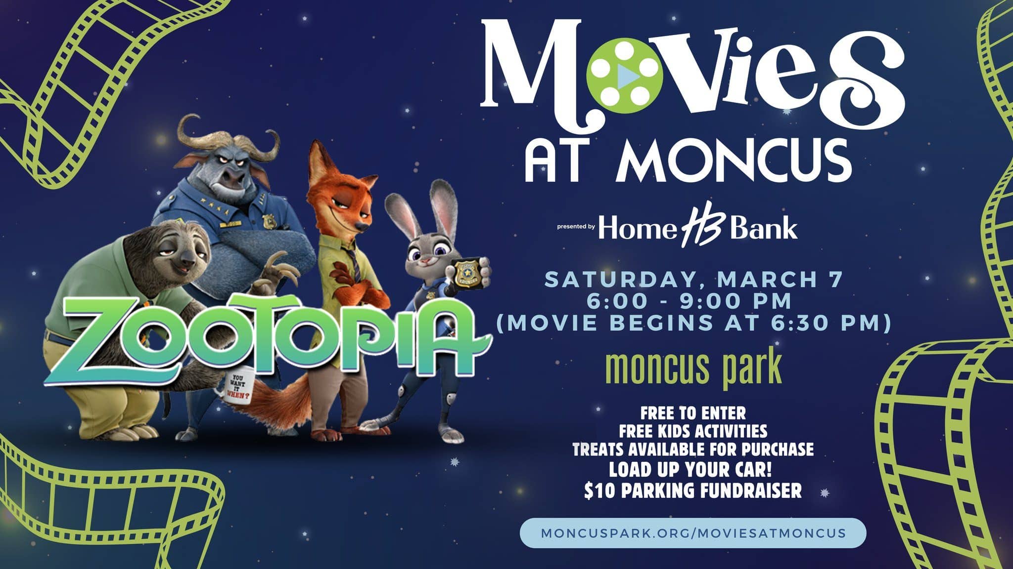 Join us at Moncus Park for a wildly fun movie night under the stars presented by Home Bank featuring Zootopia, packed with laughs, heart, and big animal energy!