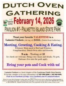 Find out more »The Dutch Oven Gathering at Palmetto Island State Park will be February 14th beginning at 9 am. The main meal feature is beef and potatoes and complimentary Dutch Oven sides and desserts. Tasting ...Read more