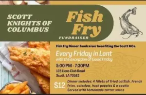 Find out more »The Scott Knights of Columbus will hold the Fish Fry Fundraiser every Friday in Lent (except Good Friday) with pickup from 5-7:30 p.m. at 123 Lions Club Road. The meal includes fried catfish, ...Read more