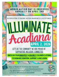 Find out more »Autism Society Acadiana invites you to “Illuminate Acadiana” on April 2nd for World Autism Acceptance Day. Wear bright or neon colors, snap a photo, and show your support for local ...Read more