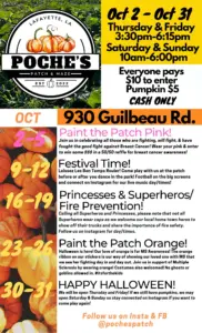 Find out more »Poche’s Pop Up Shop Patch and Maze will be open in Lafayette on Guilbeau Rd. October 2-31, 2025 Thursday – Sundays. $10 admission and $5 per pumpkin.