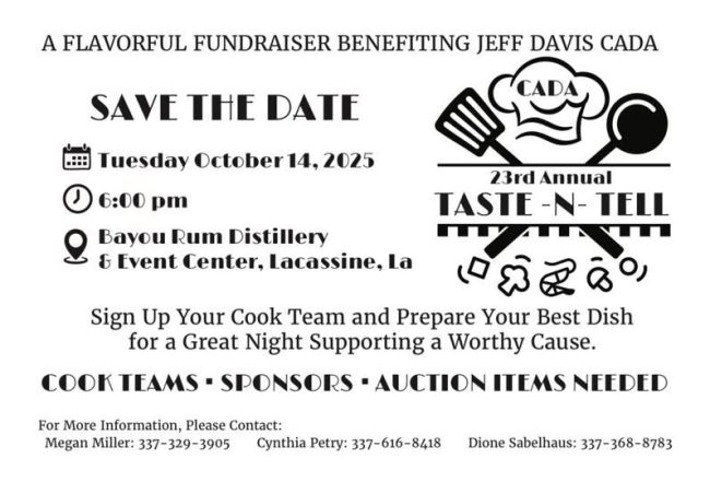 The 23rd Annual flavorful Taste N Tell fundraiser benefiting Jeff Davis CADA will be held October 14th at Bayou Rum Distillery & Event Center.