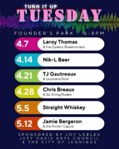 Find out more »Jeff Davis Art Council and the City of Jennings present Turn It Up Tuesday, a free outdoor concert at Founder’s Park in Jennings from 6-8 p.m. 4/7 Leroy Thomas & the Zydeco Roadrunners 4/14 Nik-L Beer 4/21 Tj Gautreaux& Louisiana Soul 4/28 Chris Breaux and Six String Rodeo 5/5 Straight Whiskey 5/12 Jamie Bergeron and the Kickin’ Cajuns