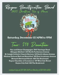 Rayne Beautification Board 2025 Christmas Tour of Homes Saturday, December 13th from 4 to 9 p.m. $10 per ticket donation. ...Read more