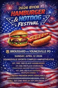 The Krewe de Acadiana will host the 3rd Annual BYOB (Bringing You Our Best) Hamburger & Hotdog Festival on Sunday, April 12, 2026, from 10:00 AM to 5:00 PM at the Youngsville Sports ...Read more